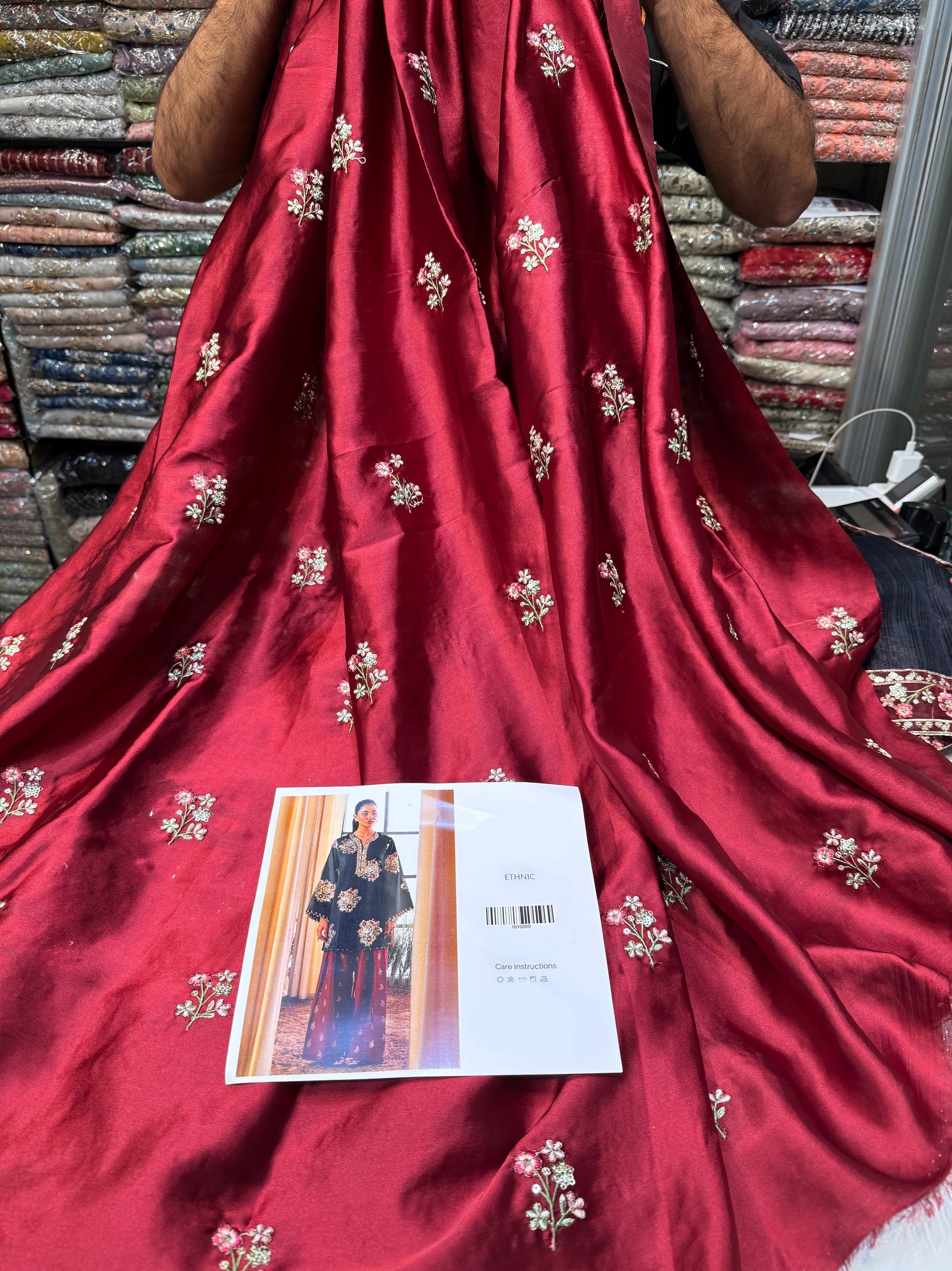 - Pure Charmeuse Silk Embroided Sleeves.